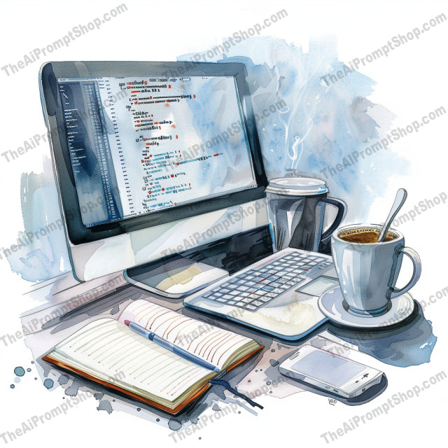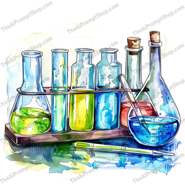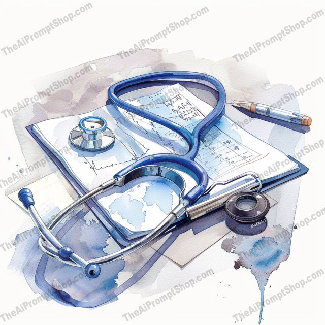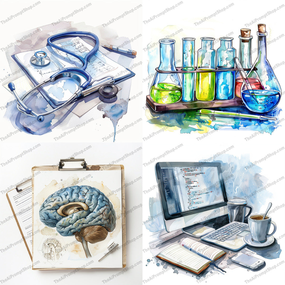 A beautifully detailed illustration ideal for lovers of scientific studies. This piece combines various elements such as medical tools, laboratory equipment, a brain sketch, and a coding workstation, all depicted in a watercolor style. The artwork brings an artistic touch to educational and scientific themes, making it perfect for study rooms, offices, and educational institutions.