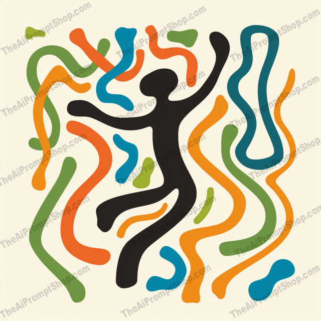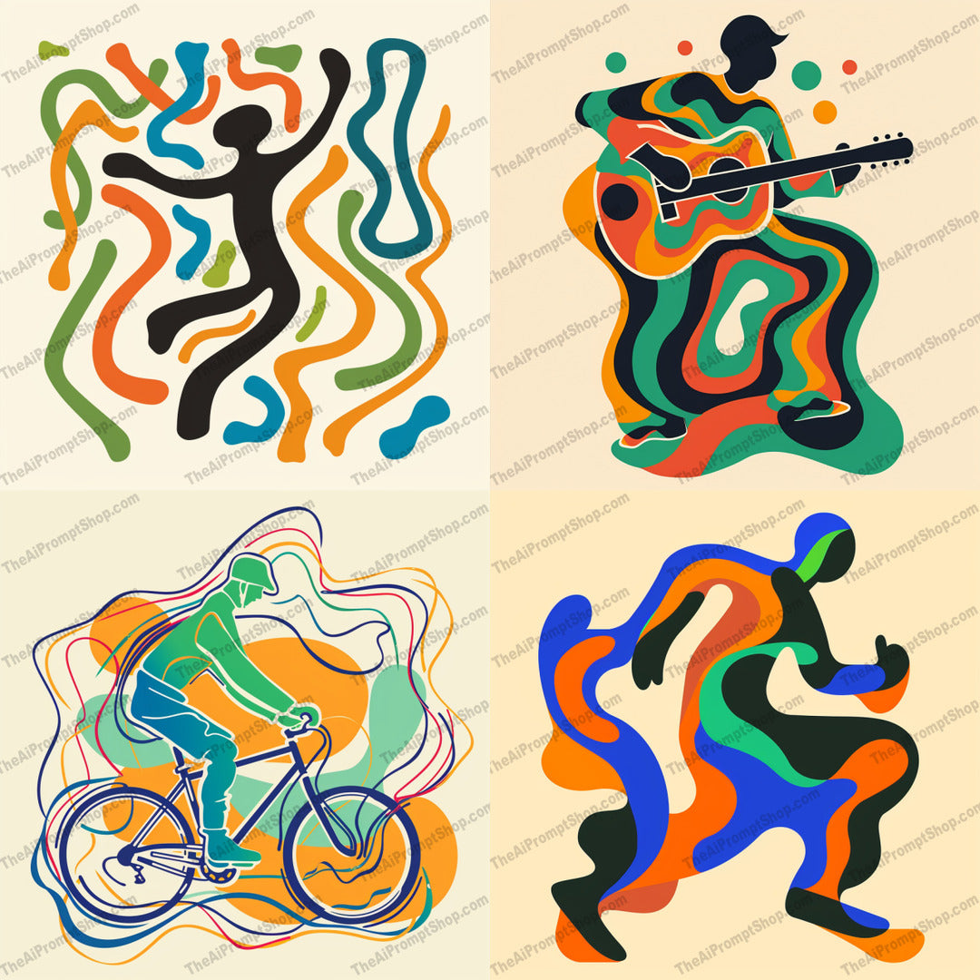 A vibrant and dynamic abstract image showcasing fluid lines and shapes to represent human activities such as dancing, playing guitar, cycling, and running. The use of bold colors and flowing patterns creates a vivid and energetic visual experience.