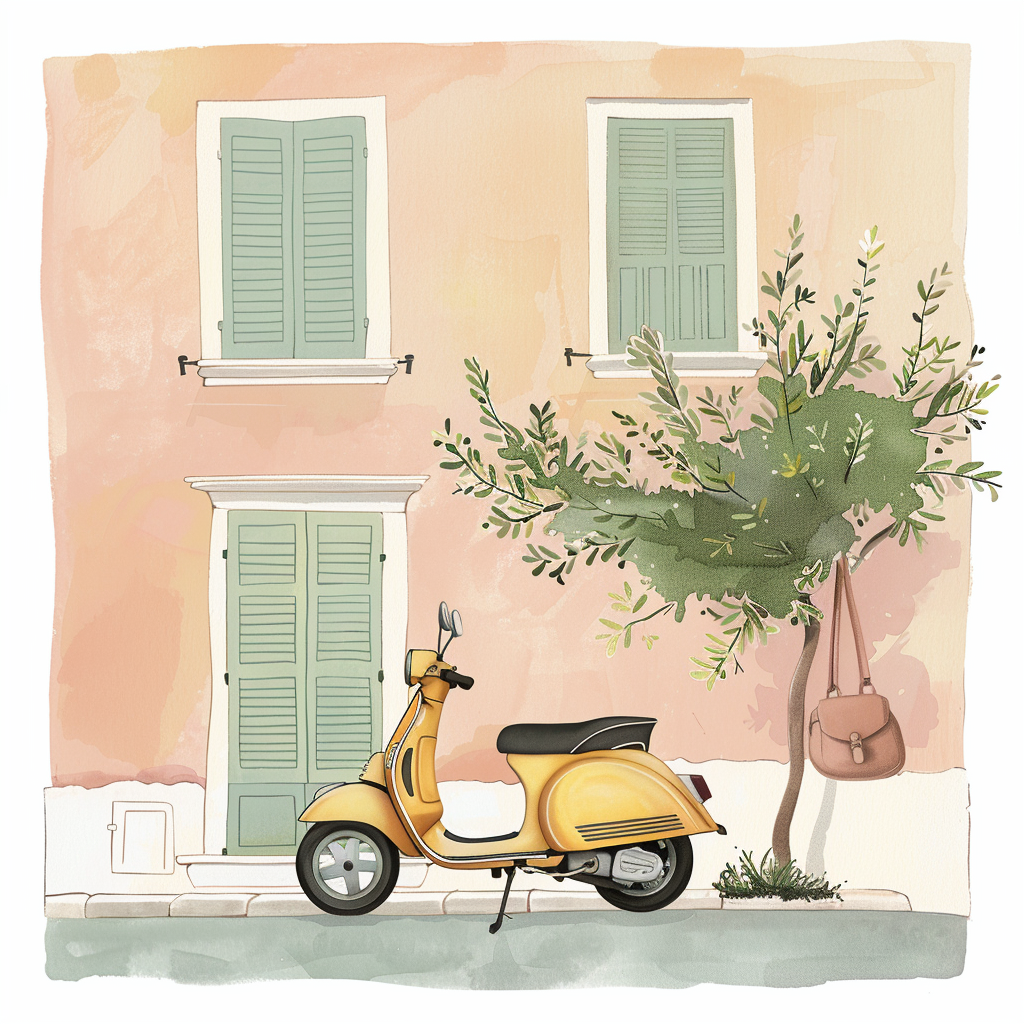 A beautifully drawn watercolor image encapsulating a serene and nostalgic scene. This unique art piece features a tranquil street with a bicycle parked under a blooming tree, an orange vintage van beside a palm tree, a charming countryside cottage with a motorcycle, and a highly detailed, intricately designed mystical creature. Perfect for adding a touch of whimsical beauty to any space.