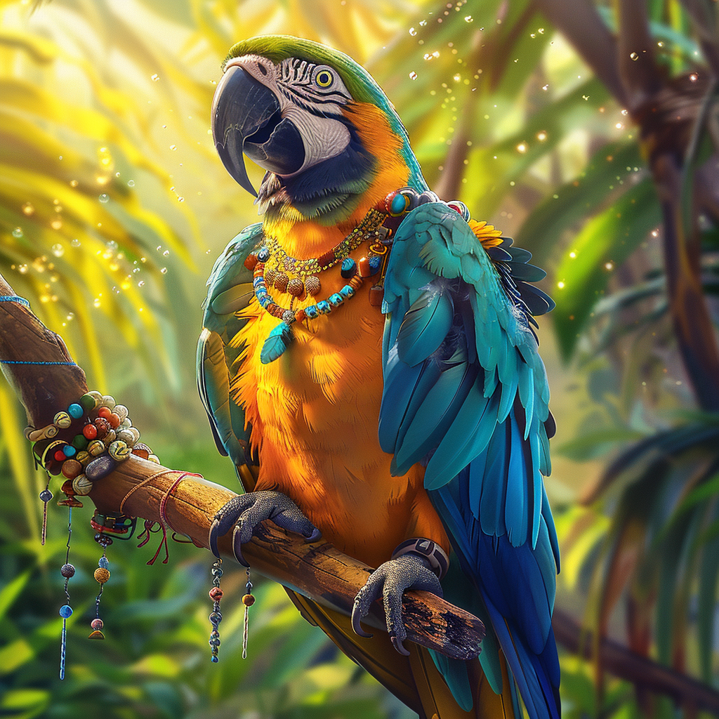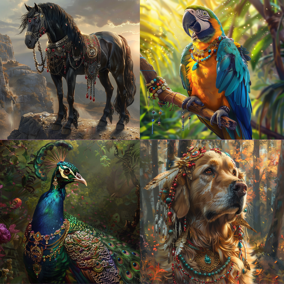 A beautifully detailed image showcasing a harmonious blend of mystical creatures and beings, adorned with elaborate jewelry and surrounded by nature. The style reflects a fantastical world filled with rich colors and intricate designs.